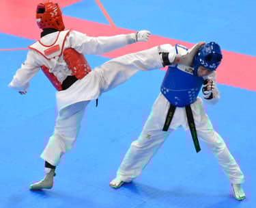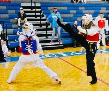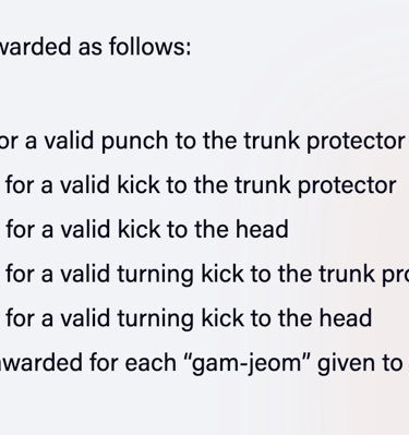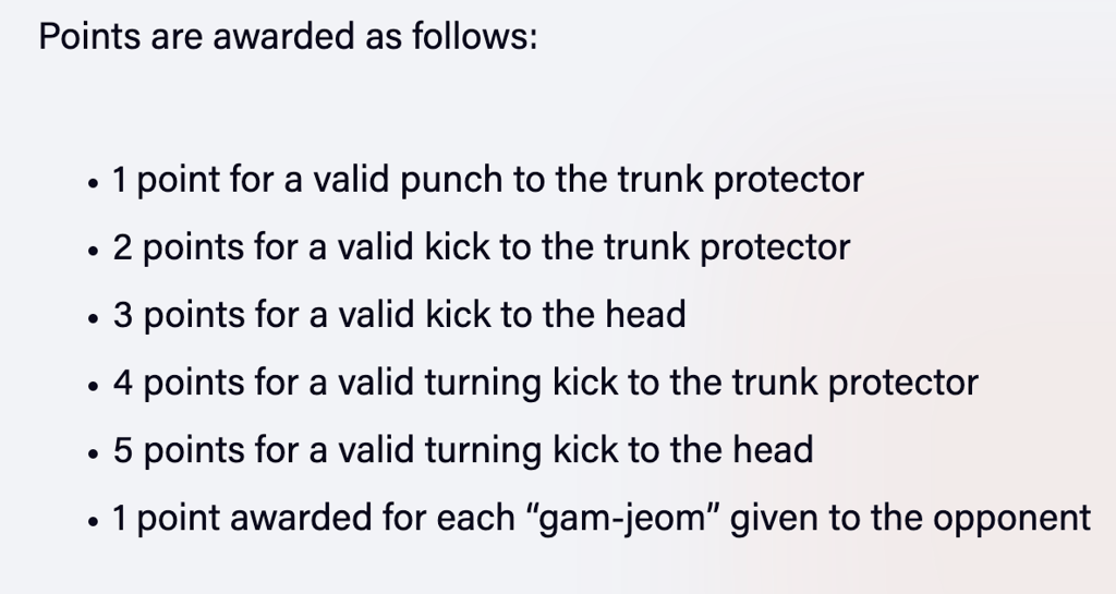 Because we are promoting martial arts skillsets, striking the head with the hands will not score any points. If a competitor strikes the head with a hand strike, the first infraction will result in a warning. The second will result in a Gam Jeom. All strikes to the head and face should be with the feet only to display excellent skill. This is why the head kicks result in the most points scored.